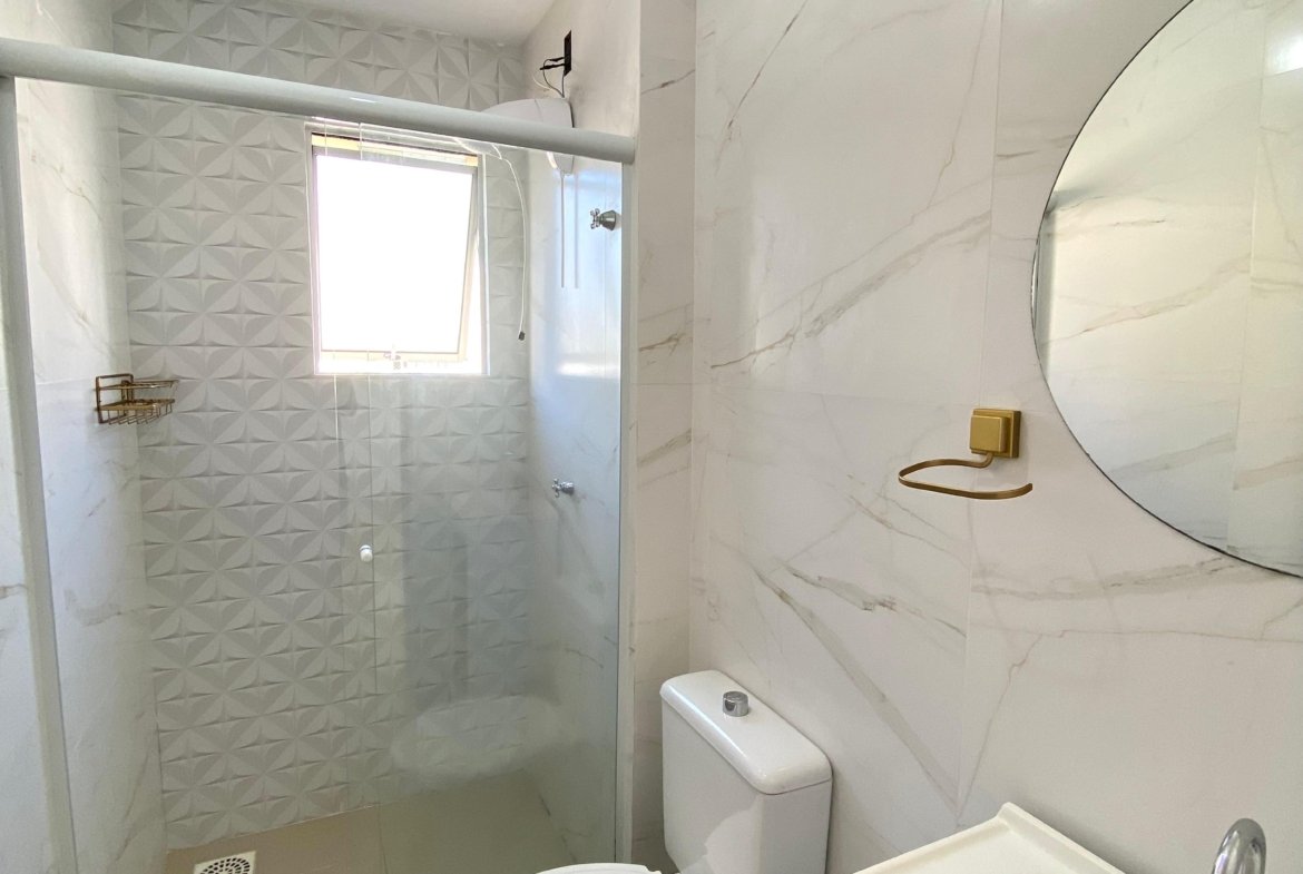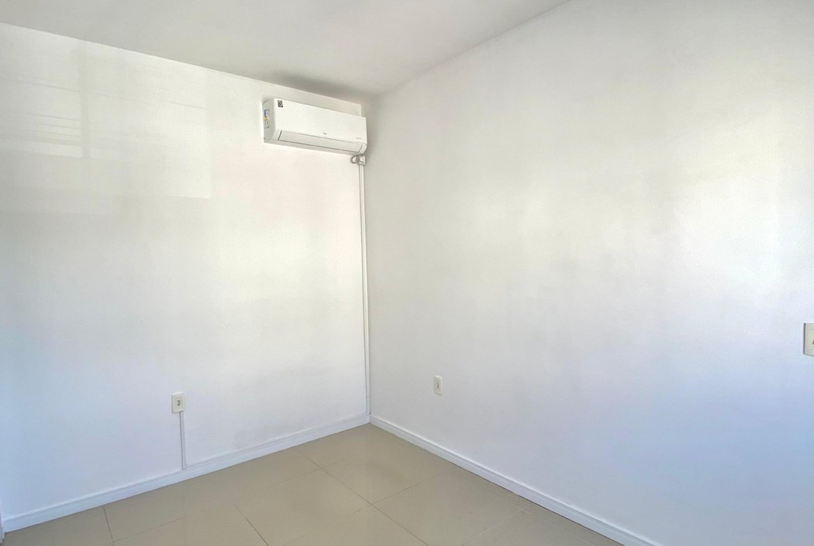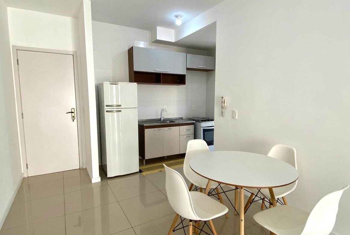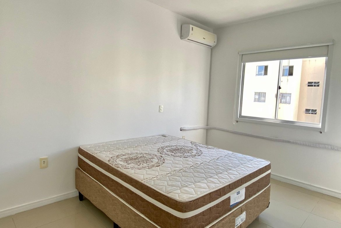 Apartamento semimobiliado, com 2 dormitórios, ambos equipados com ar-condicionado e persianas, sendo um deles com cama de casal. A área social dispõe de uma ampla sala para dois ambientes, sala de jantar já conta com mesa e 4 cadeiras.