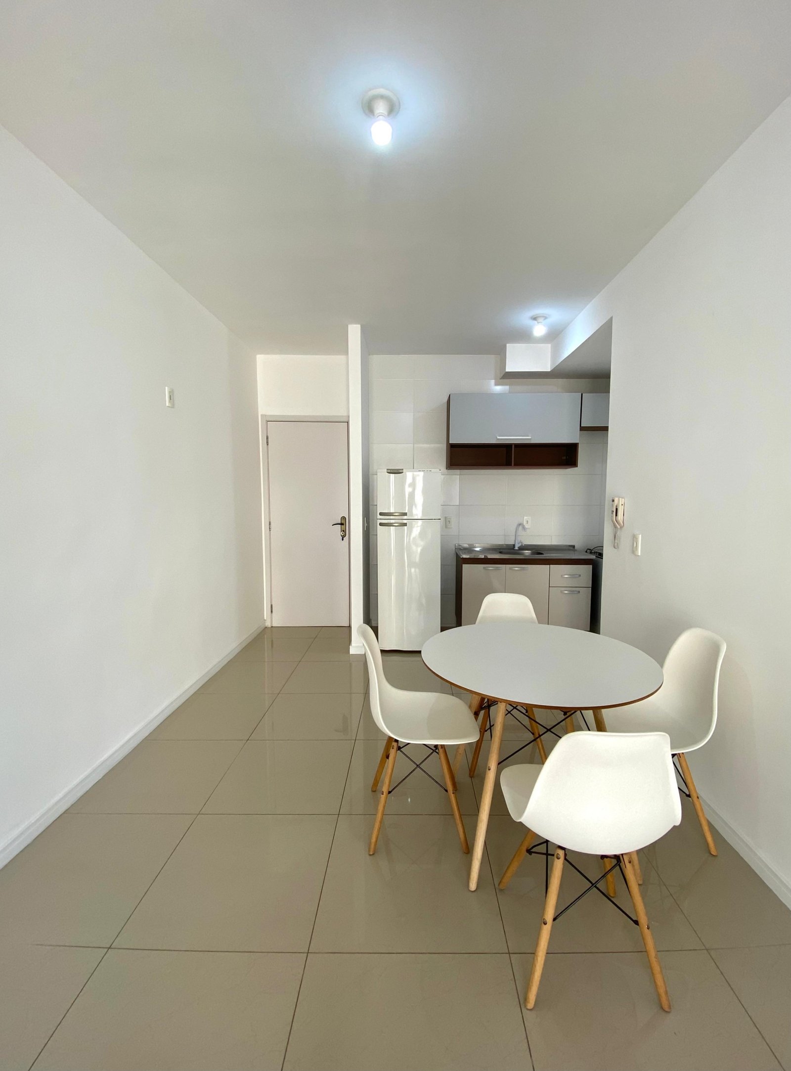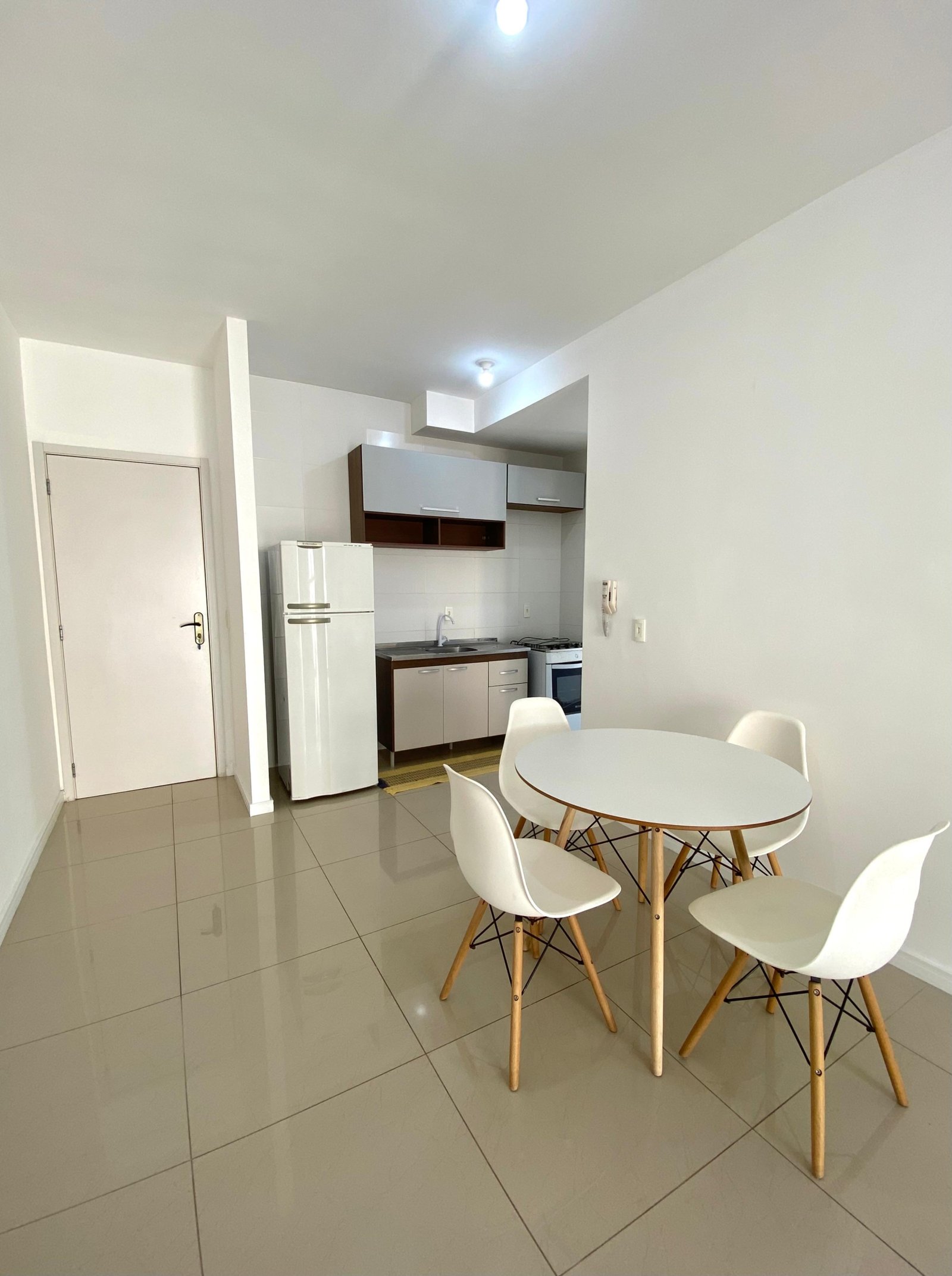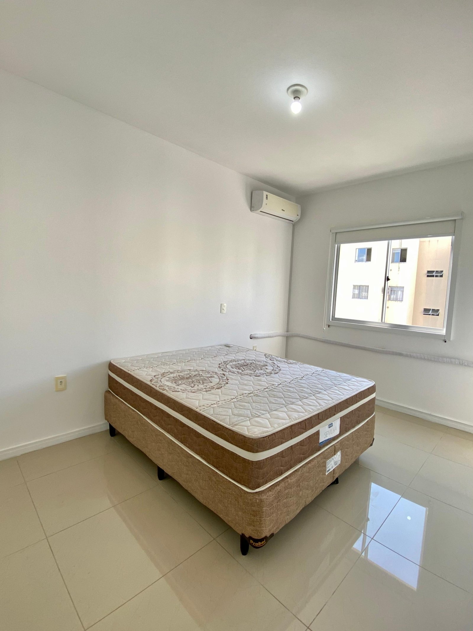 Apartamento semimobiliado, com 2 dormitórios, ambos equipados com ar-condicionado e persianas, sendo um deles com cama de casal. A área social dispõe de uma ampla sala para dois ambientes, sala de jantar já conta com mesa e 4 cadeiras.