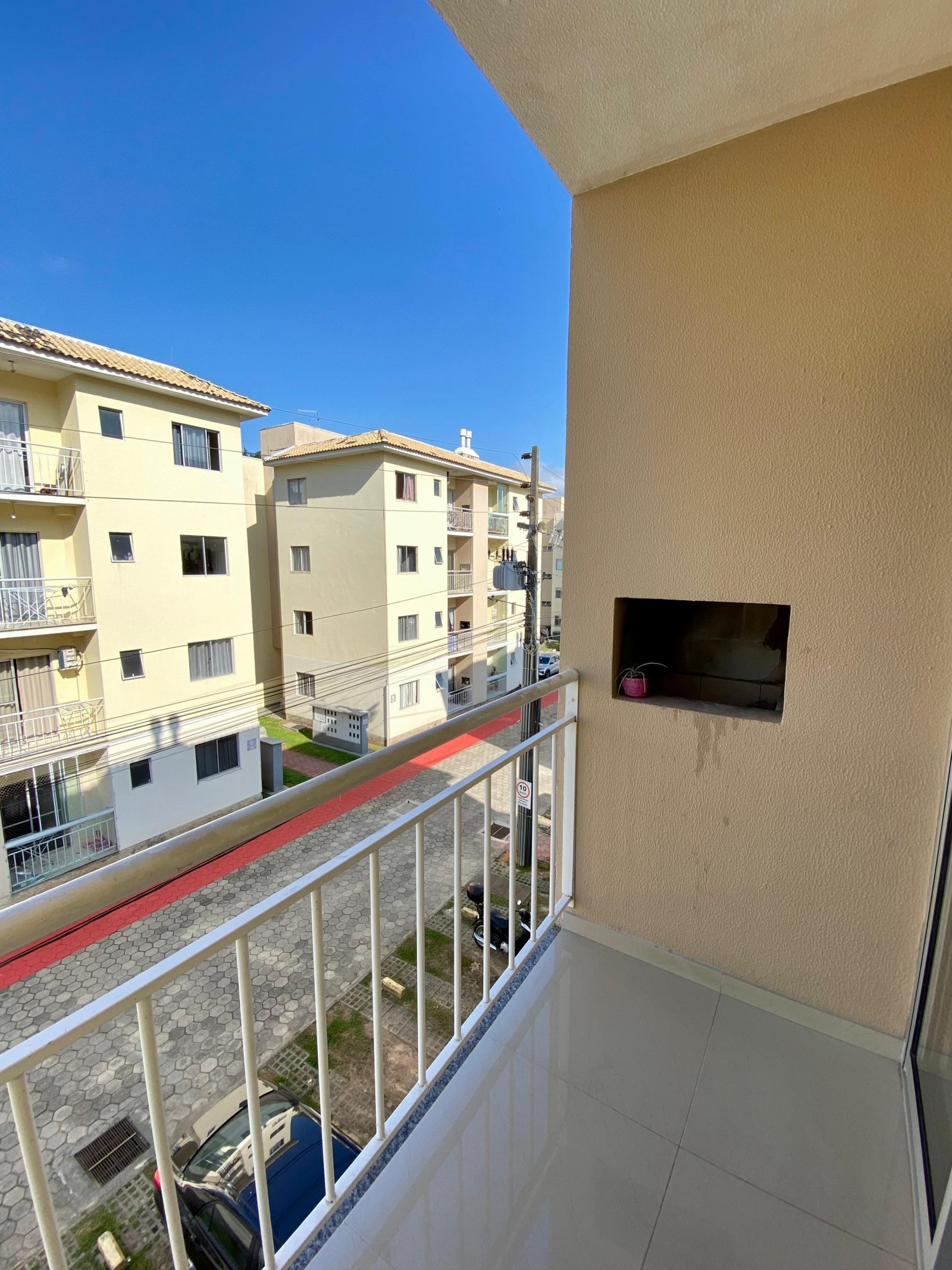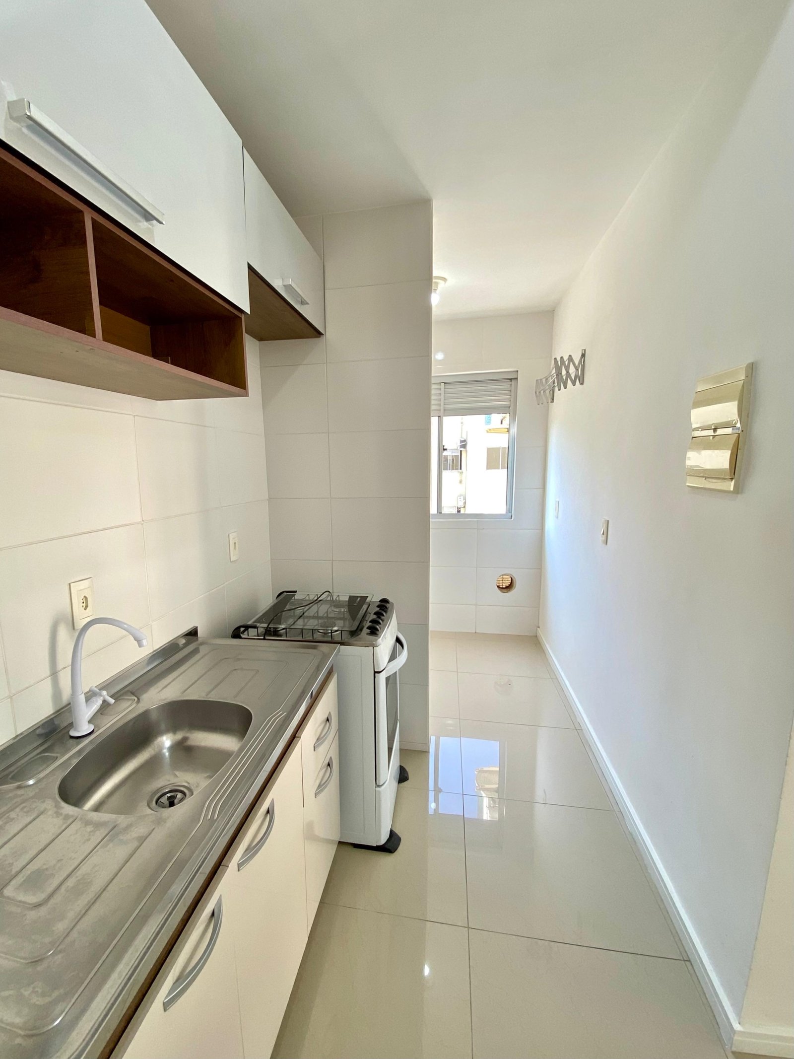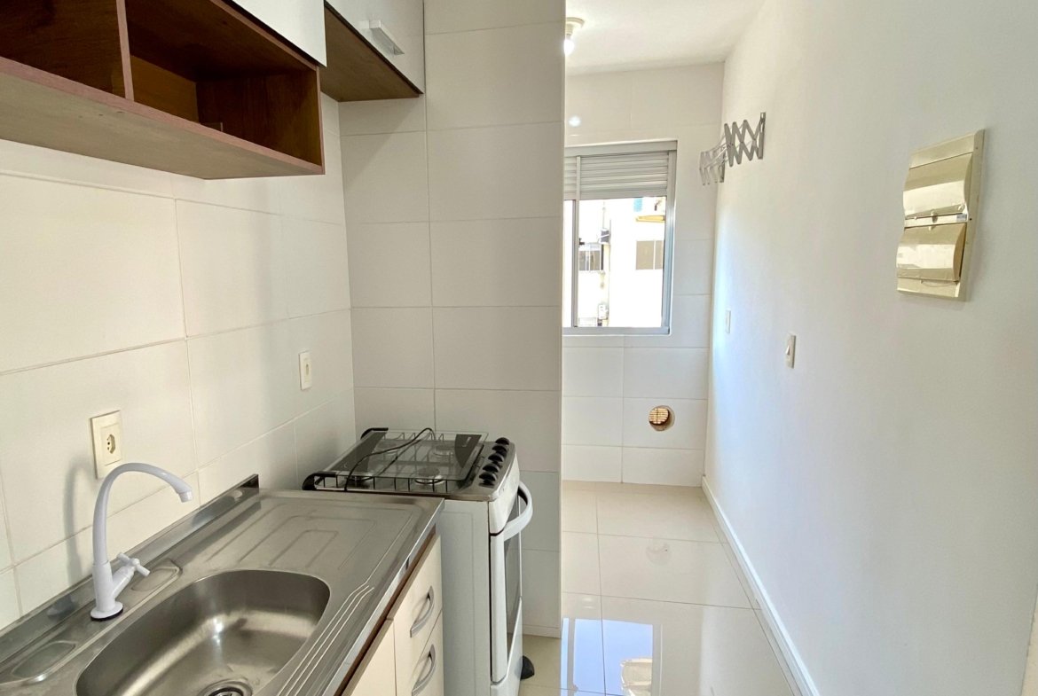 Cozinha completa, equipada com balcão, armários, fogão com forno e geladeira duplex, além de área de serviço independente. Possui ainda sacada com churrasqueira a carvão, perfeita para momentos de lazer.