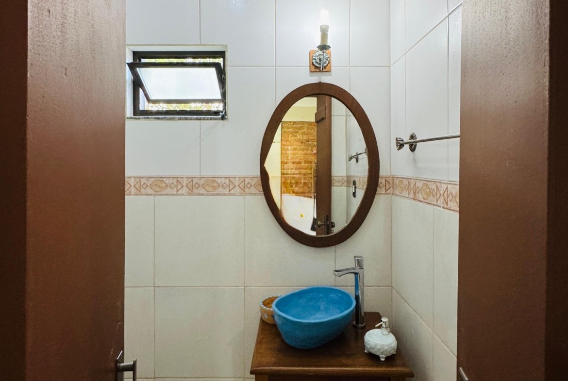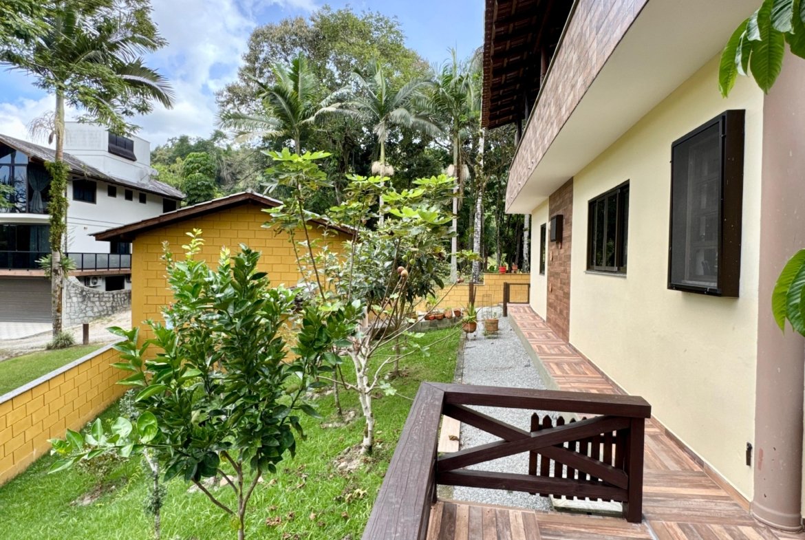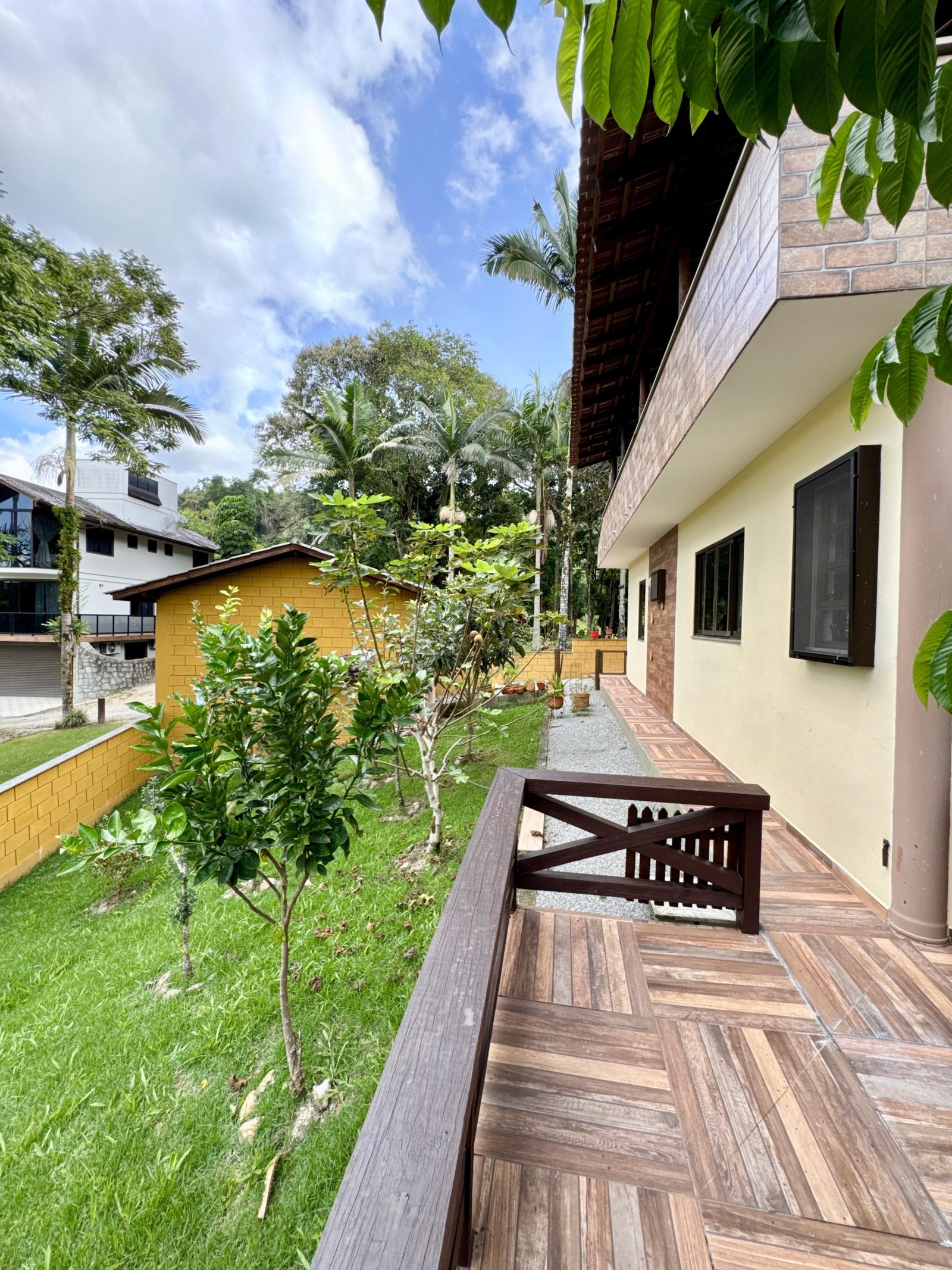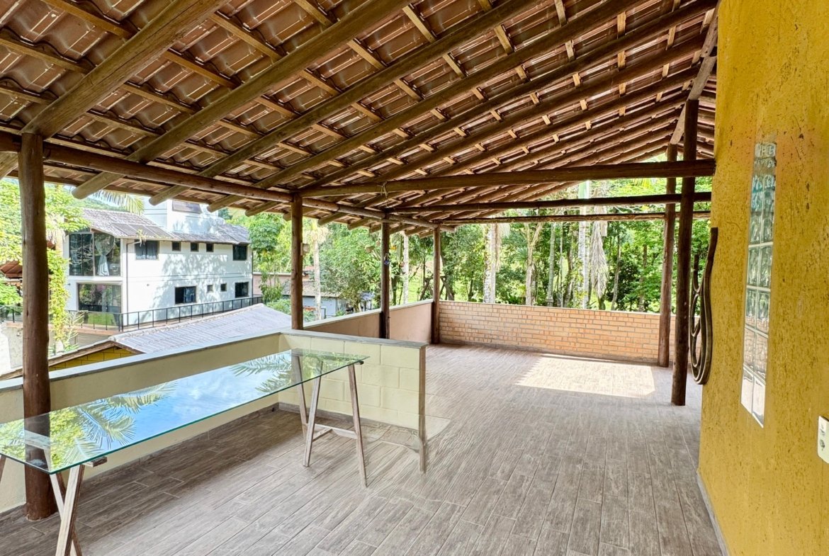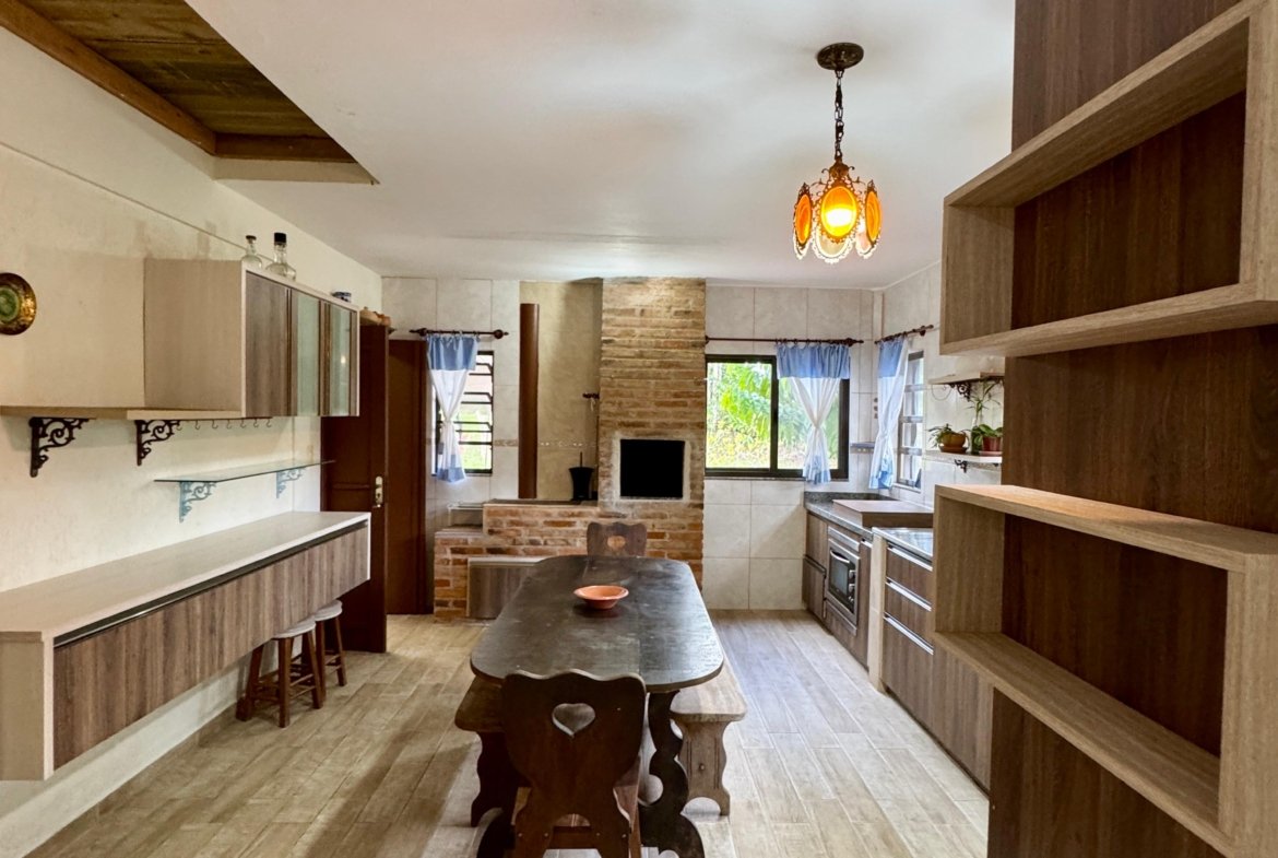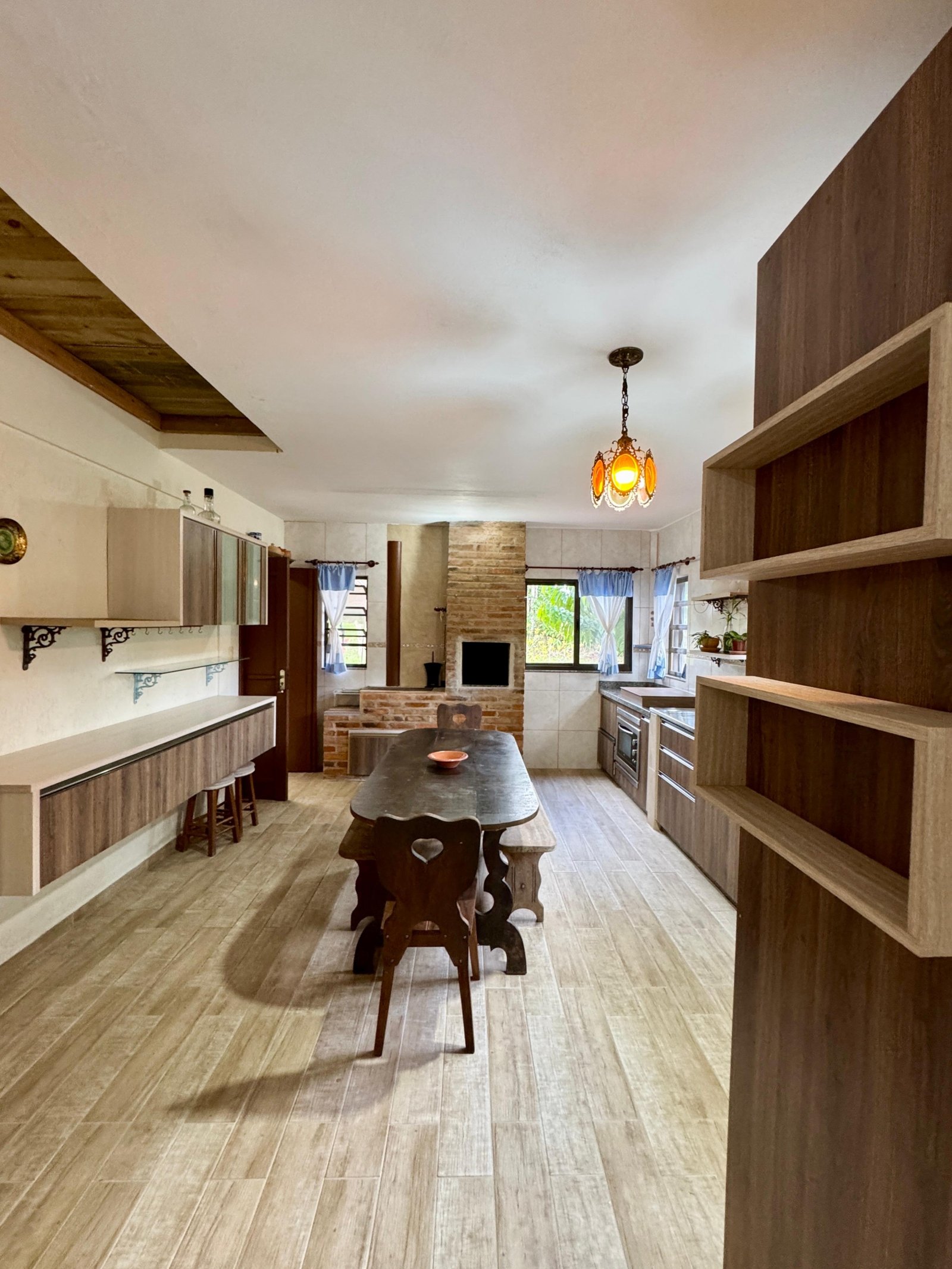 Casa com árvores frutíferas, mobiliada duas suítes (uma com closet) ar condicionado nas suítes e sala, cozinha completa com churrasqueira a carvão e fogão a lenha, lavanderia independente, escritório, lavabo, terraço com vista, varanda externa, garagem para dois carros.